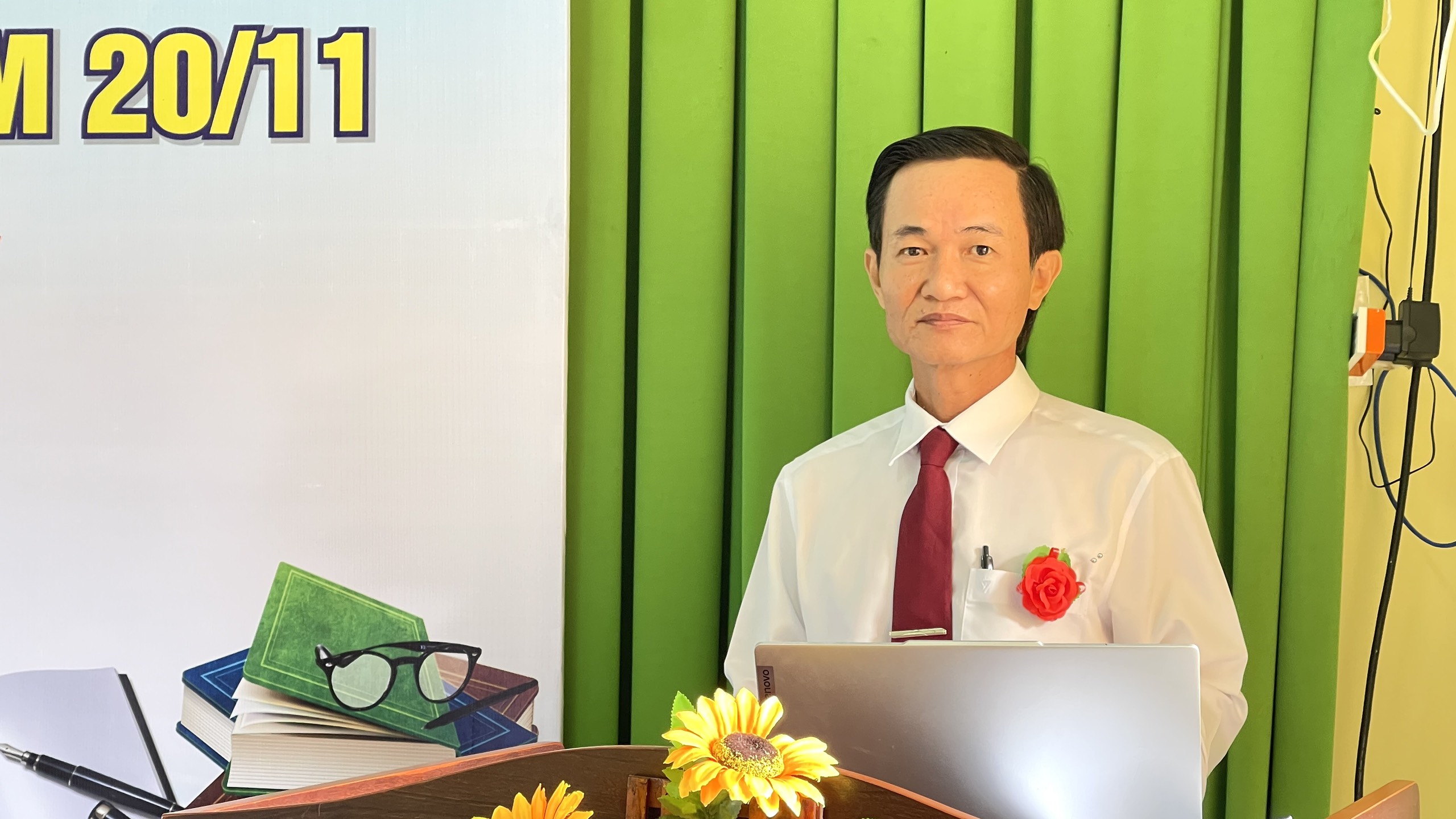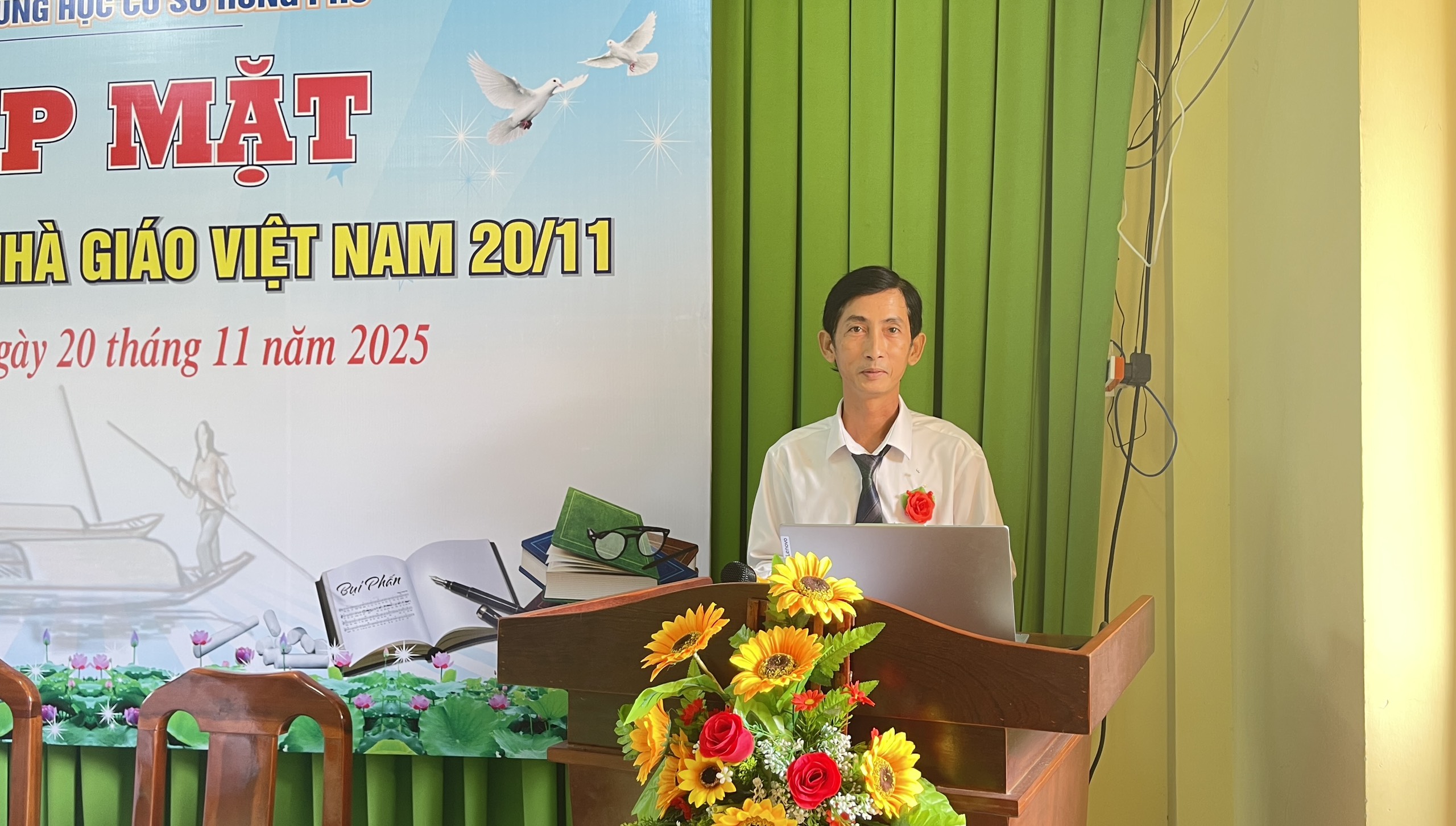 Trong không khí trang nghiêm, thầy Trần Thanh Tân – Hiệu trưởng nhà trường đã có bài phát biểu ôn lại truyền thống vẻ vang của Ngày Nhà giáo Việt Nam. Tiếp nối dòng cảm xúc, cô Châu Thị Tuyết Mai đại diện tập thể giáo viên chia sẻ những tâm tư, trăn trở và lòng yêu nghề. Đại diện cho toàn thể học sinh, em Trần Thị Duy (lớp 8A1) đã bày tỏ lòng tri ân sâu sắc và thực hiện nghi thức cài hoa lên ngực áo thầy cô – một hành động nhỏ nhưng đong đầy tình cảm kính trọng.