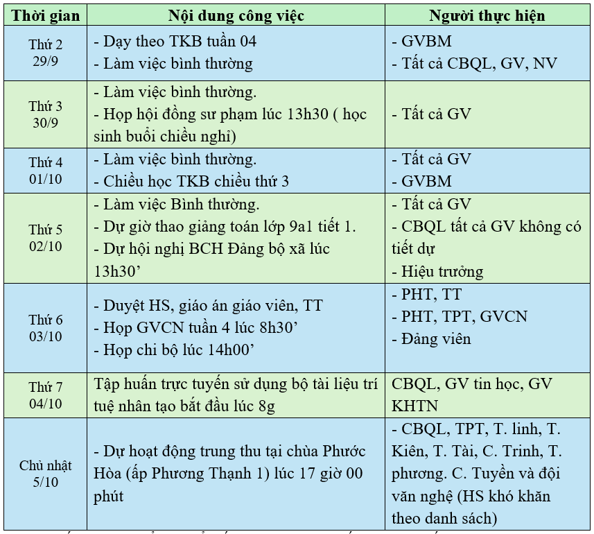 Lịch làm việc tuần 4 ngày 29/9/2025 đến ngày 4/10/2025